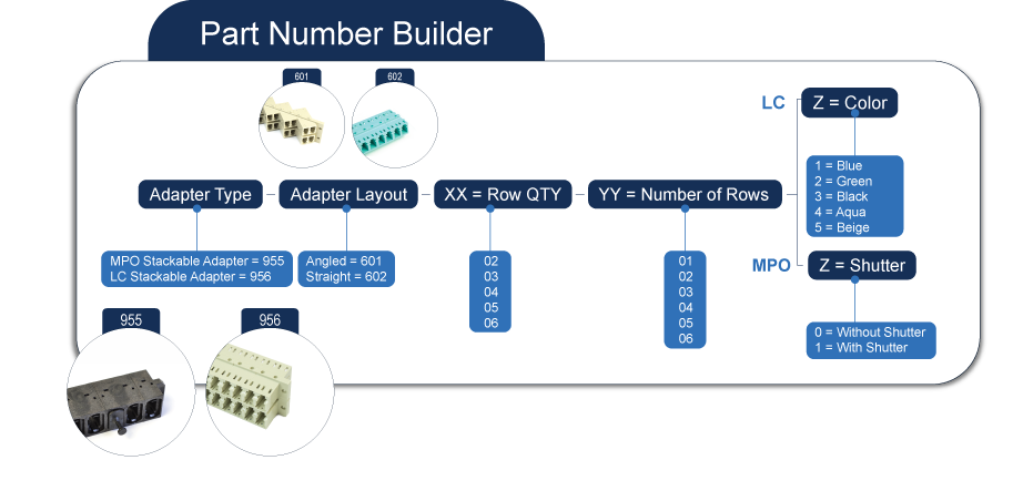 Amphenol的可堆疊適配器系統可與所有符合IEC 61754-20和TIA / EIA 604-10的行業標準LC連接器以及符合IEC 61754-7和TIA / EIA 604-5的行業標準MPO連接器系統一起使用,包括MTP®品牌的連接器。