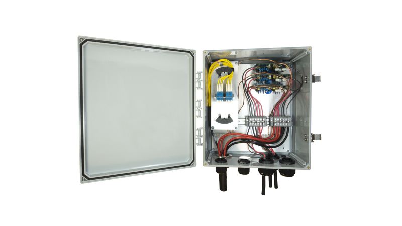 Amphenol的混合(電源和光纖)分界箱為室內(nèi)或室外設(shè)備安裝提供了出色的保護。密封的聚合物外殼可提供長壽命的耐候性位置,以標(biāo)記,組合或隔離光信號光纖和銅纜電源,以連接到各種通信設(shè)備,包括回程,宏和小型蜂窩無線應(yīng)用。入口和出口可以配置為包括銅質(zhì)電力電纜或光纖電纜。